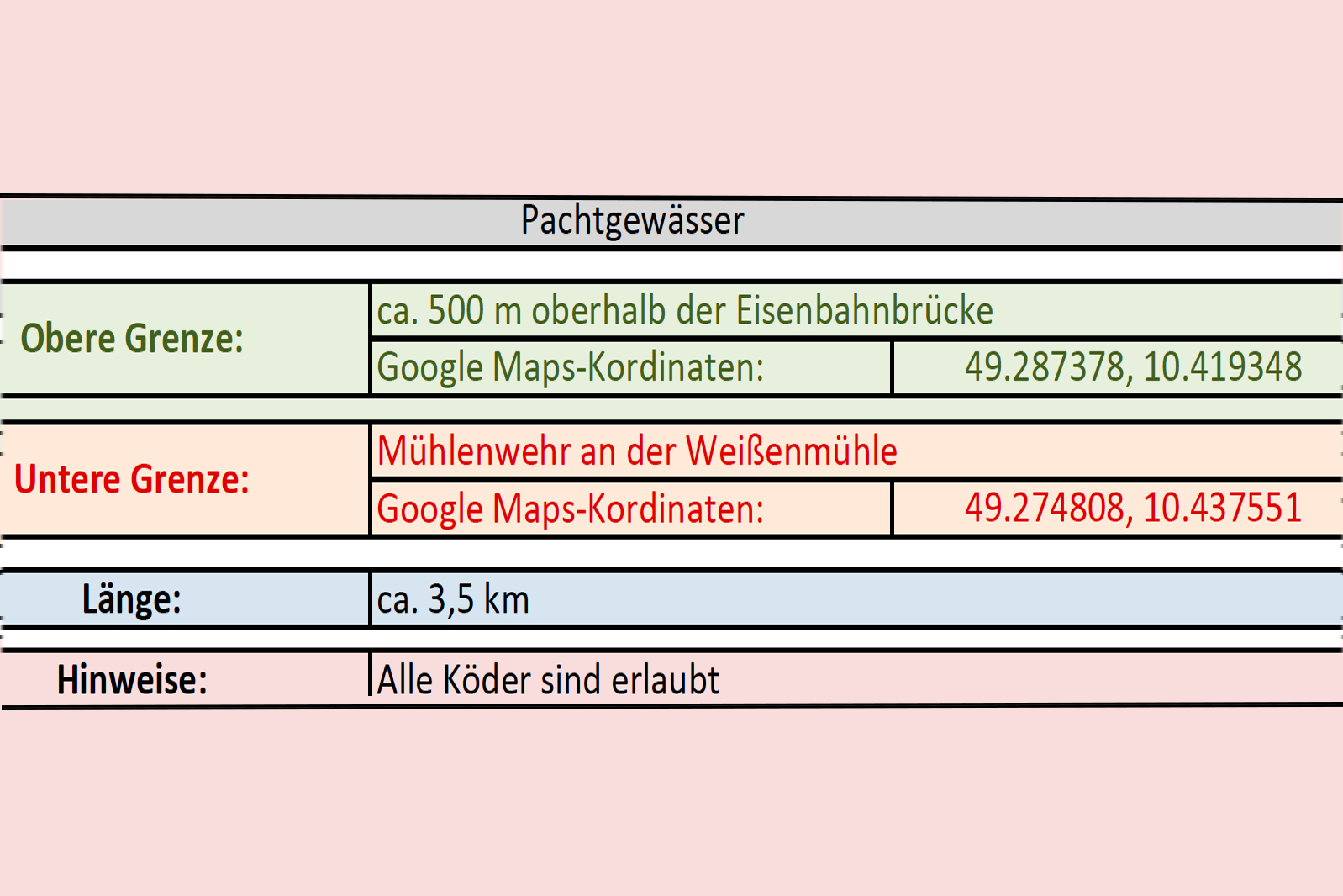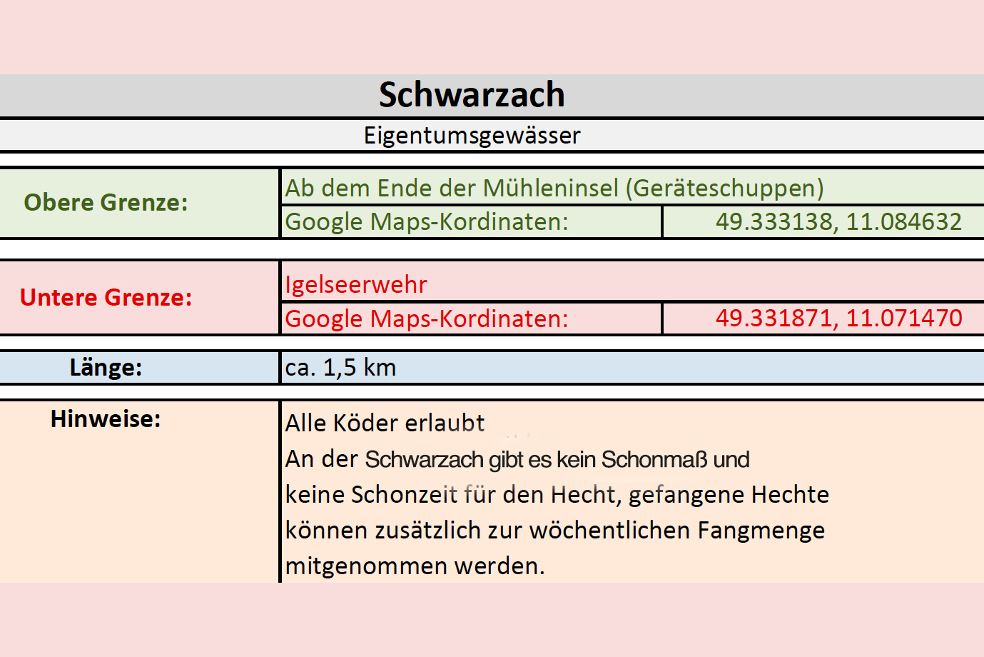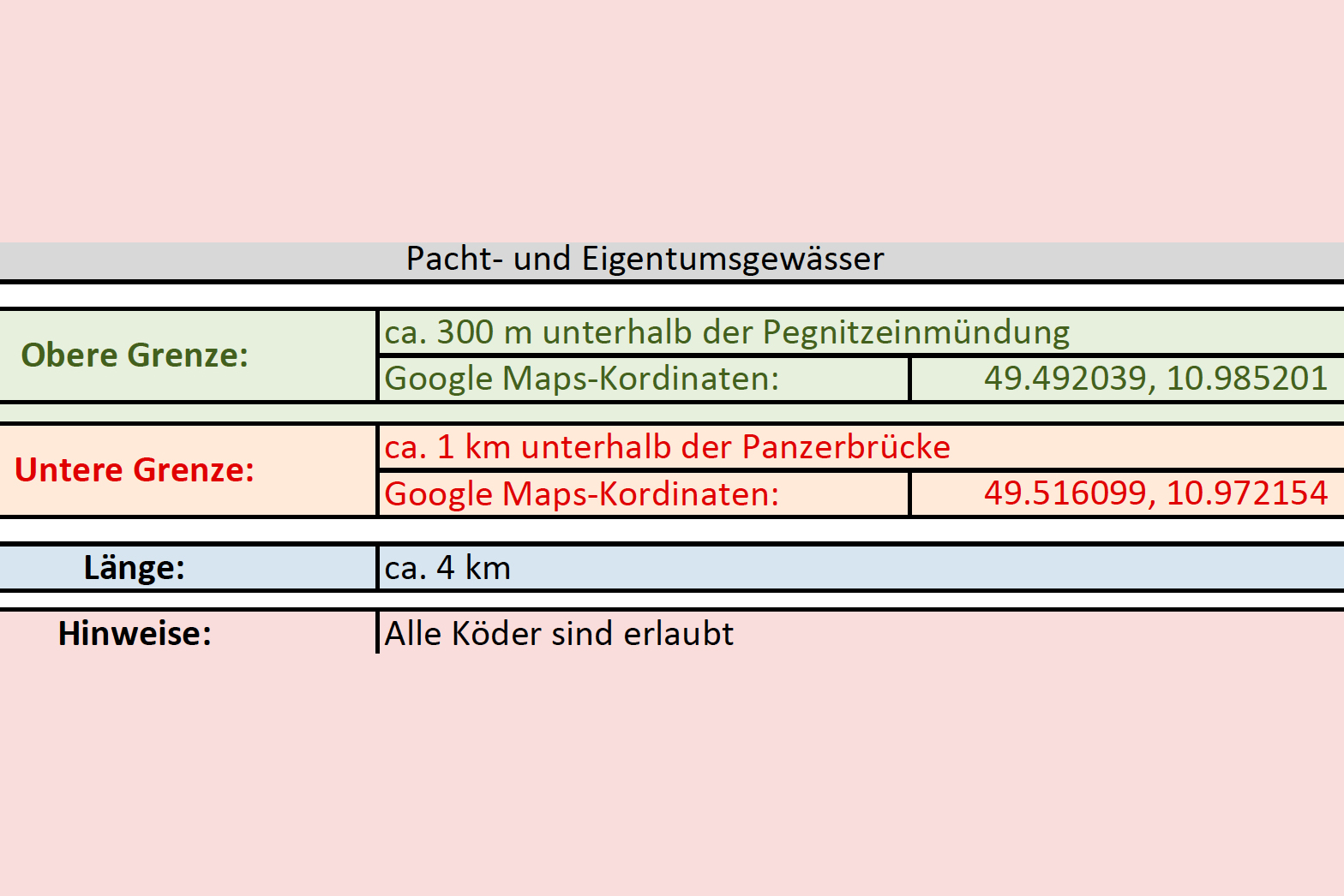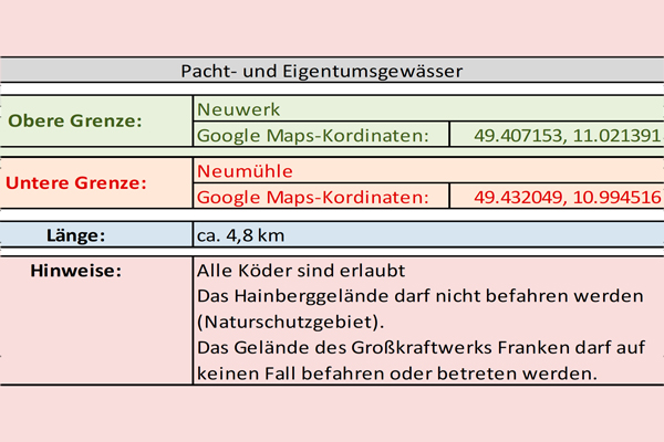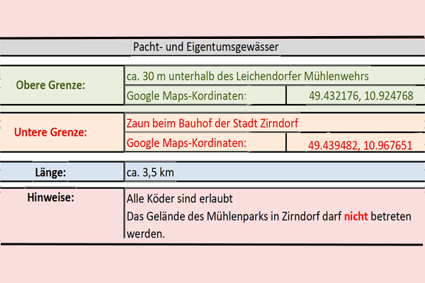 Flussaufwärts wurden 1,5 km bis zur Leichendorfer Mühle und flussabwärts ca. 1,0 km bis zum Zaun an der Kläranlage Zirndorf später hinzu gepachtet.