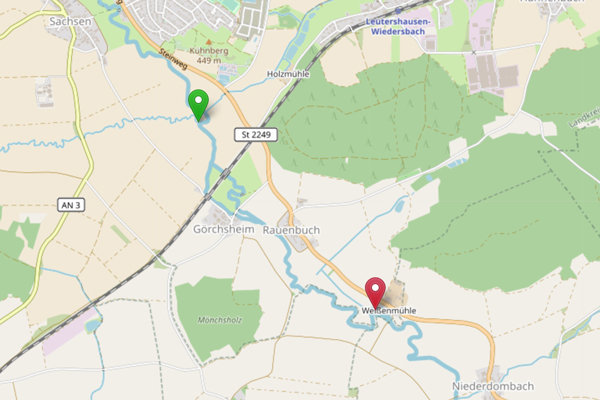 Der Abschnitt der Altmühl, den der 1. Fischereiverein Zirndorf gepachtet hat, beginnt etwa einen Kilometer südlich von Leutershausen, 500 Meter oberhalb der Eisenbahnbrücke der Bahnstrecke Ansbach-Stuttgart bei der Einmündung des Steinbachs. Untere Grenze ist der Wehrabfall der Weißenmühle. Die Altmühl schlängelt sich auf diesen 3,5 Kilometern durch ein breites Wiesental. Dort ist ihr Verlauf aus der Ferne nur durch vereinzelte Uferbäume und einen schmalen Schilfstreifen zu erkennen. Der träge dahinfließende Fluss passiert dabei die Ortschaften Görchsheim und Rauhenbuch. Aufgrund der geringen Fließgeschwindigkeit gehört der Fluss bereits hier im Oberlauf zu den Cyprinidengewässern. Die am häufigsten vorkommenden Fischarten sind deshalb Weißfische und ihre natürlichen Feinde, die Raubfische. Die Altmühl gilt schon seit Jahrzehnten als ausgesprochen gutes Hechtgewässer. Diesen Ruf kann auch unsere Flussstrecke immer wieder bestätigen, werden doch jedes Jahr Hechte mit einer Länge von bis zu einem Meter gefangen. Neben dem Hechtbestand hat sich in den letzten Jahren auch ein guter Bestand an Zandern aufgebaut und infolge von Weiherdurchbrüchen konnten auch Waller in den Fluss gelangen. Rapfen, Aitel und natürlich Aale kommen als weitere Räuber dazu. Um all diesen Raubfischen genügend Nahrung zu bieten, ist ein guter Bestand an Nahrungsfischen notwendig. Rotaugen, Rotfedern, Brachsen, Lauben und viele andere Kleinfische sind reichlich vorhanden. Auch der Karpfenangler kann an der Altmühl erfolgreich seinem Hobby nachgehen, gibt es doch nicht wenige Exemplare bis zu 25 Pfund Gewicht.
