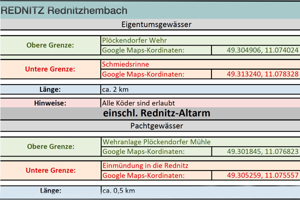Dem 1. Fischereiverein Zirndorf gelang es bereits im Jahre 1979 die ursprüngliche zwei Kilometer lange Pachtstrecke der Rednitz bei Rednitzhembach vom Plöckendorfer Mühlenwehr bis zur Schmiedsrinne käuflich zu erwerben. Befischt werden darf auch der 0,5 Kilometer lange Altarm, der neben der Wehranlage in die Rednitz mündet.