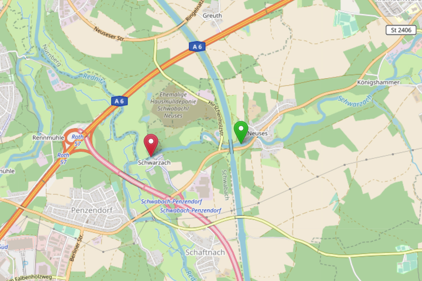 Die Schwarzach ist ein rechter Nebenfluss der Rednitz zwischen Neumarkt und Nürnberg und liegt im Grenzbereich der Flusssysteme von Donau und Rhein. Sie entspringt in einer Höhe von 425 m über dem Meer und mündet bei 312 m Höhe in die Rednitz. Die Schwarzach geht aus den Bächen “Irlgraben” und “Altweihergraben” hervor, unterquert den Ludwigskanal, eine Eisenbahnbrücke und die B 8 bei Ochenbruck, durchfließt die Schwarzachklamm, um dann noch einmal unter dem Ludwigskanal durchzufließen. Kurz vor ihrer Mündung unterquert sie auch den Main-Donau-Kanal und wird an dieser Stelle zur Überleitung von Donauwasser in den Main genutzt. Nach 53 Kilometern ihres Laufes mündet sie dann bei Schwabach in die Rednitz.